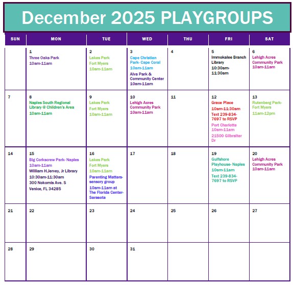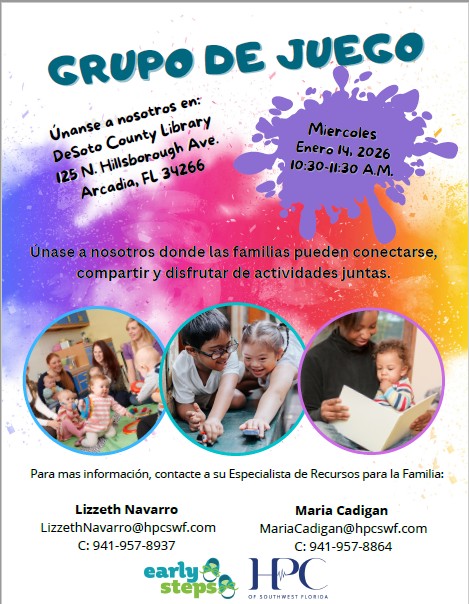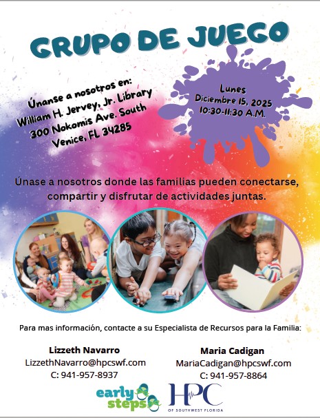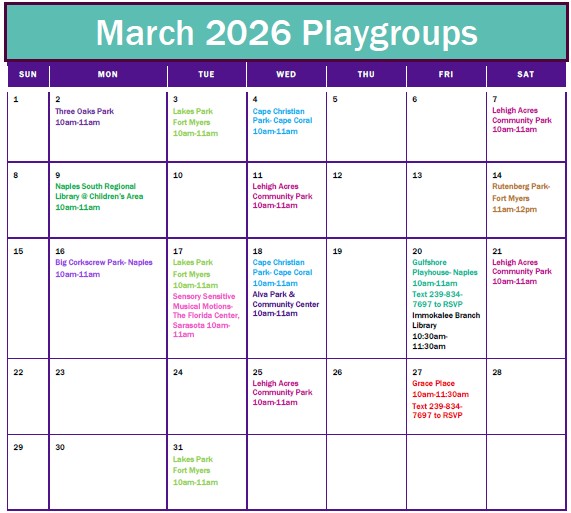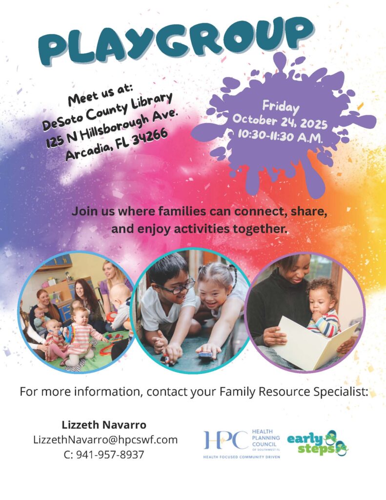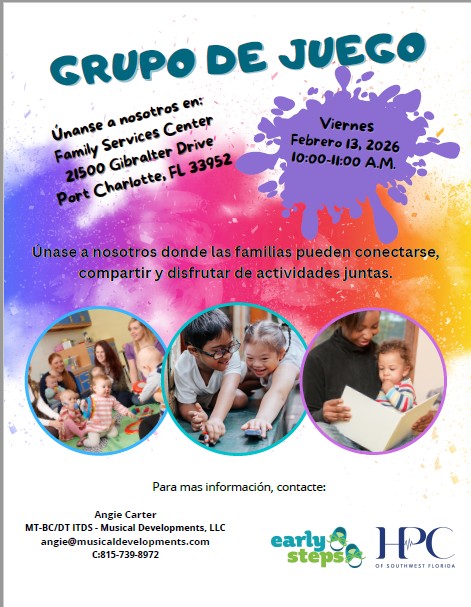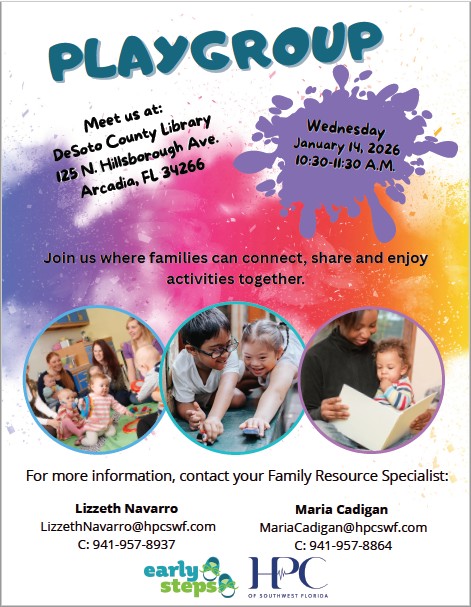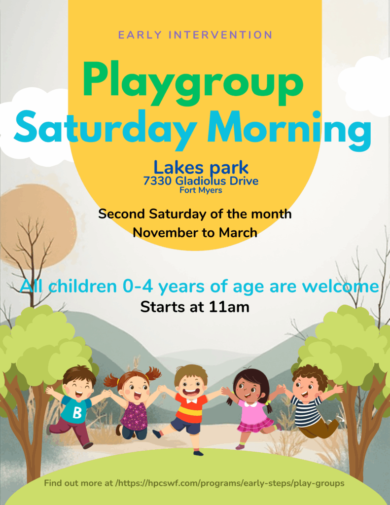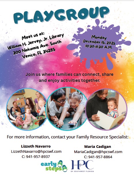 Please join us at this playgroup. For more information please call 239-910-5199 or email nelsycrowell@hpcswf.com or lizzethnavarro@hpcswf.com